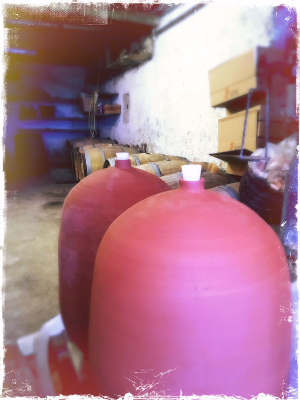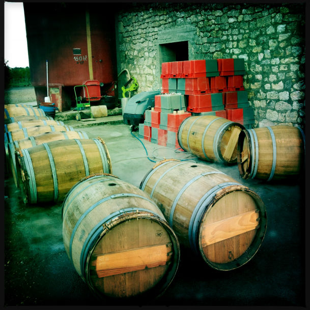 Ce sera de l'autre côté du château d'eau. Le vent s'est levé et tout autour de nous les nuages noirs s'amoncellent. Certains dont moi faisons halte au chai pour égrapper, encuver, goûter un peu de ce jus qui résulte. C'est un verre qu'on se partage. Une photo face à face avec Laurette. On se sourit. Tout est bien.